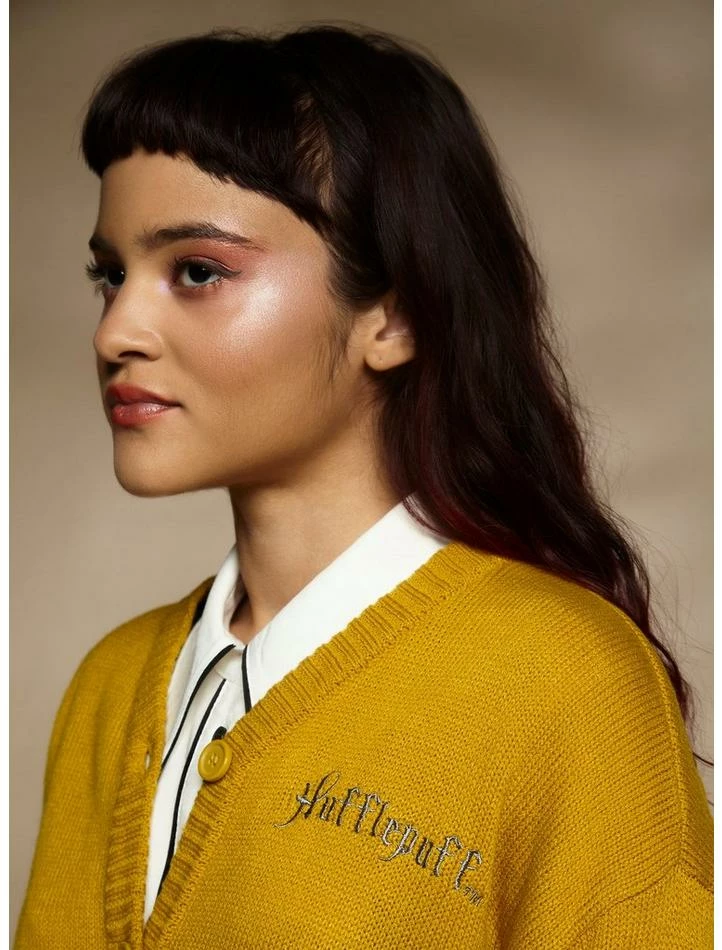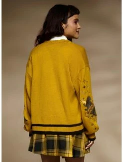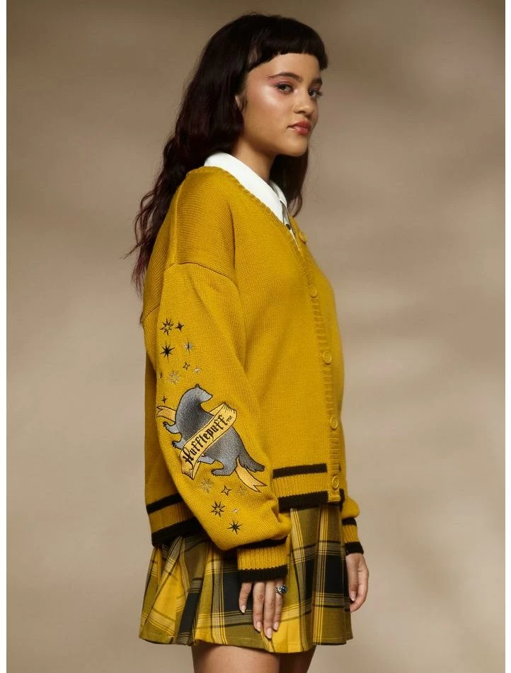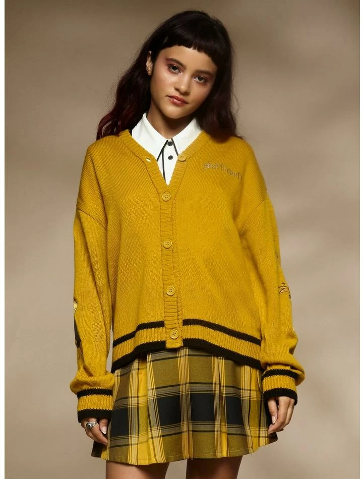 Ready for another great year at Hogwarts? Rep some house pride at the Start-of-Term Feast in thisย Harry Potterย cardigan! It has a slouchy, skimmer fit and features “Hufflepuff” embroidered at the chest. Comes with striped ribbing at the hem and cuffs, plus star and house mascot embroideries down the sleeves. Complete with a button-up closure.
